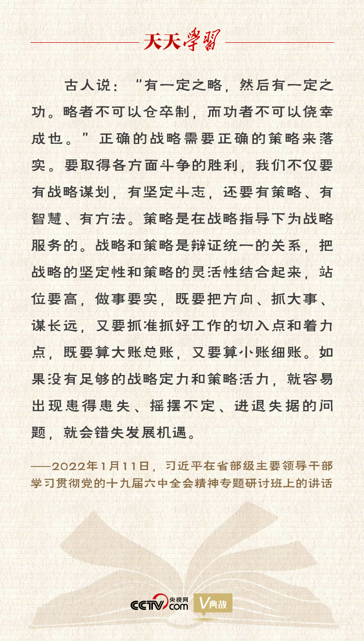 戰(zhàn)略問題是一個政黨、一個國家的根本性問題,正確的戰(zhàn)略需要正確的策略來落實。2022年1月11日,在省部級主要領(lǐng)導(dǎo)干部學(xué)習(xí)貫徹黨的十九屆六中全會精神專題研討班上,習(xí)近平總書記引用上述古語強調(diào):“把戰(zhàn)略的堅定性和策略的靈活性結(jié)合起來,站位要高,做事要實,既要把方向、抓大事、謀長遠,又要抓準(zhǔn)抓好工作的切入點和著力點,既要算大賬總賬,又要算小賬細賬。”為我們在解決突出問題中實現(xiàn)戰(zhàn)略突破、在把握戰(zhàn)略全局中推進各項工作提供了根本遵循。