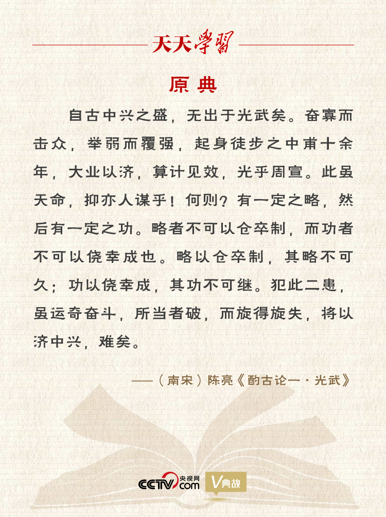 《酌古論》評價了劉秀、劉備、曹操、孫權(quán)、苻堅、韓信、諸葛亮等十九位歷史人物的軍事活動。首篇為光武帝劉秀,陳亮認為,自古中興之盛,沒有超過光武帝的,他成就掀天揭地的功業(yè),不光是靠天命,更是靠人的謀略。由此提出:“有一定之略,然后有一定之功。略者不可以倉卒制,而功者不可以僥幸成也。”“倉卒”,同“倉猝”。意思是說,有一定的謀略,然后才能建立相當(dāng)?shù)墓I(yè)。謀略不可以倉猝制定,而且功業(yè)不可能僥幸取得成功。并指出:“略以倉卒制,其略不可久;功以僥幸成,其功不可繼。”謀略如果倉猝制定,也不可能長久實施;功業(yè)即使僥幸取得成功,也不可能持續(xù)發(fā)展。