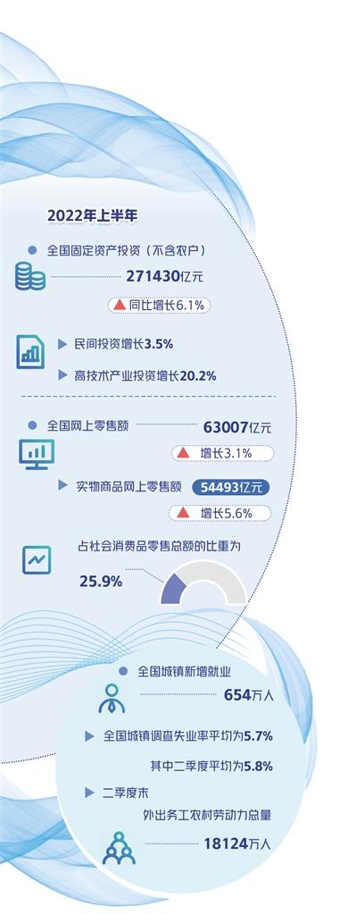 今年上半年,面對異常復雜困難局面,各地區各部門高效統籌疫情防控和經濟社會發展,國民經濟企穩回升。固定資產投資持續增長,高技術產業和社會領域投資增長較快;市場銷售有所改善,基本生活類商品零售較快增長;就業形勢好轉,城鎮調查失業率回落;居民收入穩定增長,城鄉居民人均收入比值縮小,民生保障有力有效。
