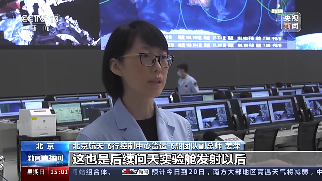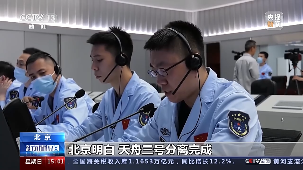總臺央視記者 劉冠青:這里是北京航天飛行控制中心,我們可以從我身后的大屏幕看到,現在天舟三號已經完成了中國空間站天和核心艙前向對接口的分離,現在正在轉19米的保持。