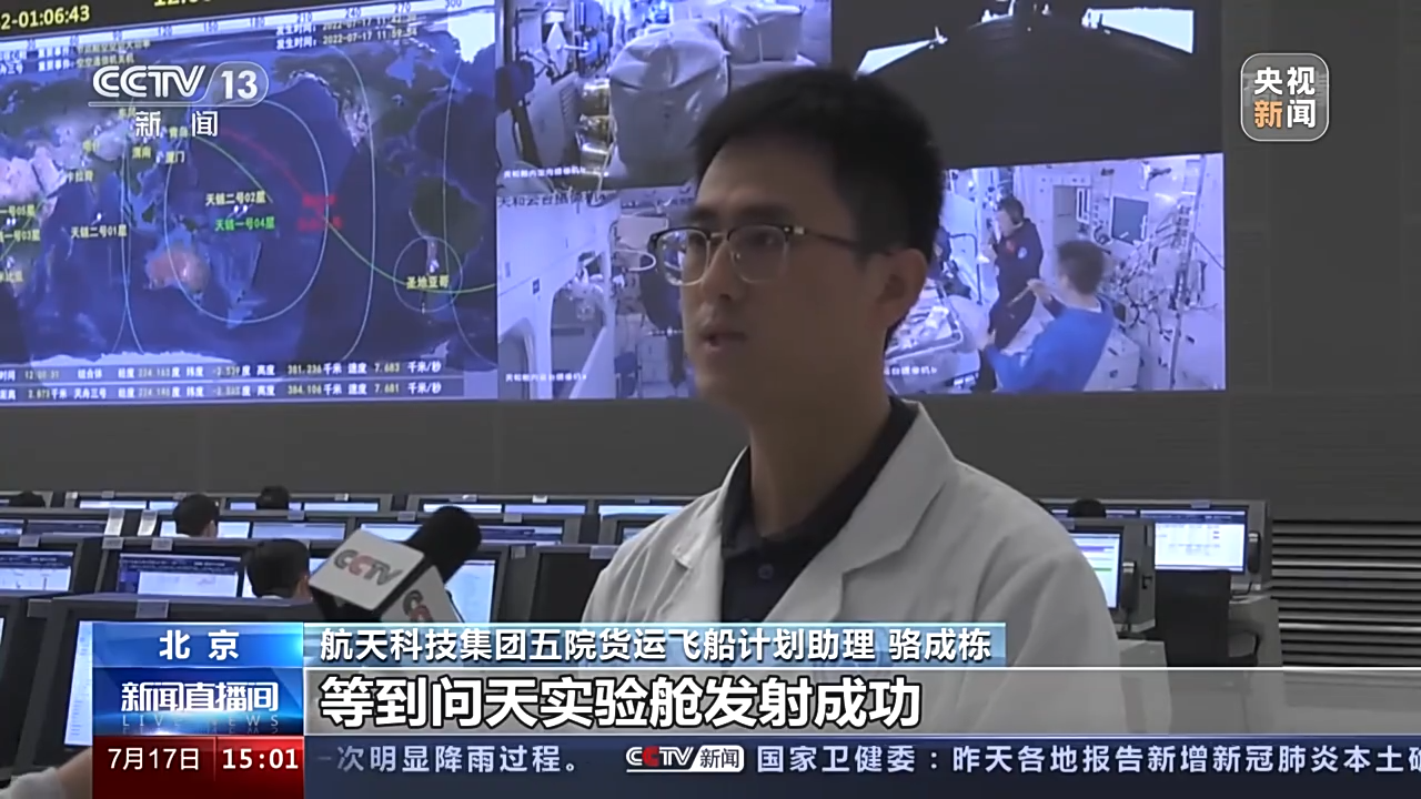 航天科技集團五院貨運飛船計劃助理 駱成棟:天舟三號目前已經進入一個獨立飛行的狀態,然后等到問天實驗艙發射成功與這個空間站組合體完成對接之后,我們的天舟三號將會觸控離軌,屆時我們將會通過兩次軌道的控制,然后將天舟三號飛船的軌道降低。