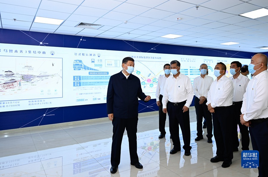 12日,習(xí)近平總書(shū)記來(lái)到烏魯木齊國(guó)際陸港區(qū)考察。在大屏幕前,習(xí)近平總書(shū)記通過(guò)實(shí)時(shí)畫(huà)面察看中歐班列(烏魯木齊)集結(jié)中心各功能區(qū)和阿拉山口口岸、霍爾果斯口岸現(xiàn)場(chǎng)作業(yè)情況。