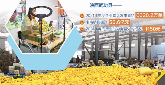 目前,在武功直接與電商相關的人員已有萬人,帶動就業數萬人。王雷說,對于有30多萬常住人口的西部縣城而言,以農產品精深加工為重點的電商物流已成為“首位產業”,2021年電商產業助力全縣人均增收1150元。
