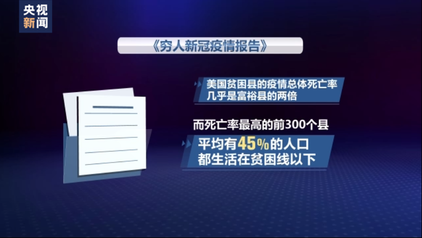 美國窮人權益組織與聯(lián)合國經(jīng)濟學家合作編寫的一份《窮人新冠疫情報告》指出,美國貧困縣的疫情總體死亡率幾乎是富裕縣的兩倍,而死亡率最高的前300個縣,平均有45%的人口都生活在貧困線以下。還有調(diào)查顯示,疫情期間近20%的美國家庭花光了全部儲蓄,將近三分之二年收入低于50000美元的美國家庭難以支付房租、醫(yī)療和食品開銷,尤其是非洲裔和拉美裔家庭受沖擊最大。