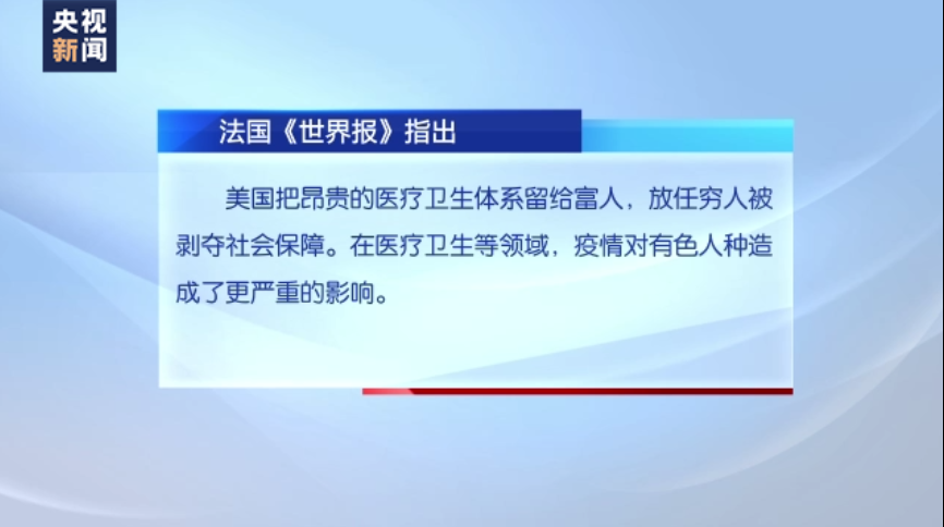 法國《世界報》指出,美國把昂貴的醫(yī)療衛(wèi)生體系留給富人,放任窮人被剝奪社會保障。在醫(yī)療衛(wèi)生等領域,疫情對有色人種造成了更嚴重的影響。