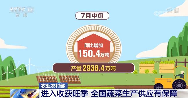 農業農村部最新發布的數據顯示,當前全國蔬菜在田面積10572.1萬畝,同比增加399.6萬畝;7月中旬產量2938.4萬噸,同比增加150.4萬噸。總體看,當前蔬菜面積基數大,特別是黃土高原、東北、西北等夏秋蔬菜優勢區在田蔬菜進入收獲旺季,上市量增加較多,全國蔬菜生產供應是有保障的。