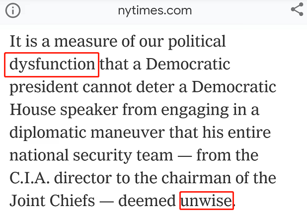 弗里德曼對美國總統(tǒng)拜登沒能叫停佩洛西的挑釁行為難掩失望,指出這是美國的“政治失靈”——“民主黨總統(tǒng)無法阻止一項民主黨議長的外交操弄,盡管從中央情報局到美軍參謀長聯(lián)席會議的所有國安團隊都認為此行是不明智的”。