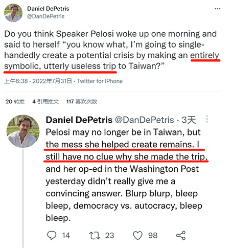 美國知名專欄作家丹尼爾·德彼得里斯一直在關(guān)注此事。佩洛西竄訪前,他發(fā)文表示此舉是“純象征性的,完全無用。”事件發(fā)生后,他再次強調(diào),佩洛西竄訪給當?shù)亓粝聽攤子,仍然無法理解她為何執(zhí)意竄訪,而她的自我辯解沒有說服力,純屬聒噪。