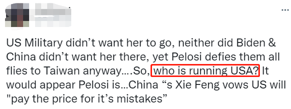 一位網(wǎng)友表示,各方都不希望佩洛西竄訪中國臺灣地區(qū),但她就是這么一意孤行去了。那么問題來了,白宮勸都勸不住,“美國到底誰說了算?”