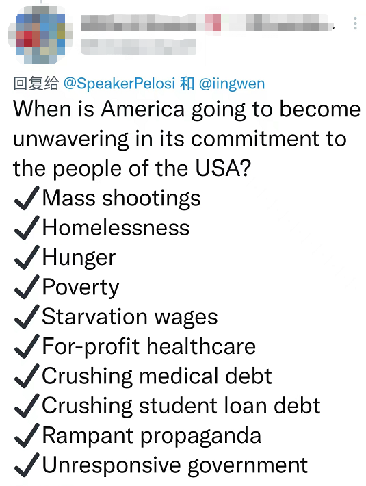 佩洛西在社交媒體發(fā)的“邀功”帖子也被網(wǎng)友“現(xiàn)場打臉”。一位網(wǎng)友在評論區(qū)列出了美國國內(nèi)從槍支暴力到債務(wù)高企等十大“頑疾”,質(zhì)問佩洛西忙于“拱火”,是不是忘了對美國人民的承諾?