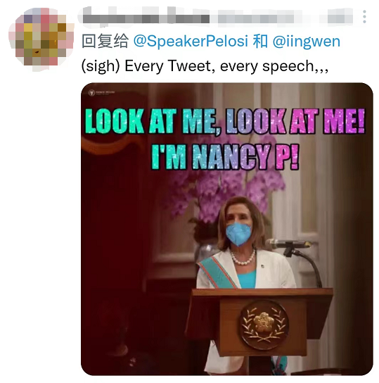 有網(wǎng)友實在怒其不爭,給一心作秀博眼球的佩洛西做了個表情包——“看我看我!我是南希·佩洛西!”這位網(wǎng)友嘆道,佩洛西每次發(fā)消息和講話,都讓人失望。