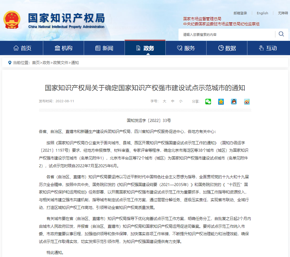 國家知識產權局關于確定國家知識產權強市建設試點示范城市的通知