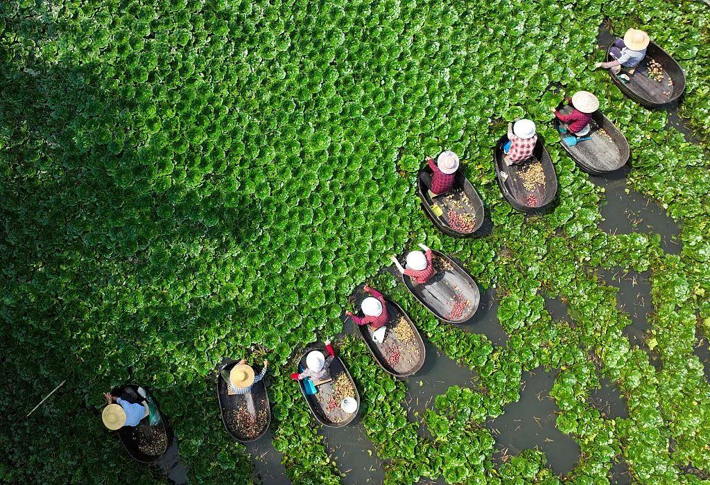 2022年9月7日,浙江湖州德清縣四都村菱塘,村民在水面采菱。
