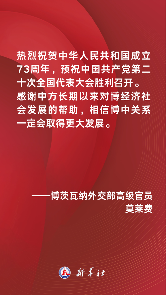 我駐外使領(lǐng)館、使團(tuán)近日舉辦線下或云端國(guó)慶招待會(huì)等活動(dòng),慶祝中華人民共和國(guó)成立73周年,多個(gè)國(guó)際組織負(fù)責(zé)人、國(guó)家政要及各界人士出席活動(dòng)或以其他方式發(fā)表致辭,對(duì)中華人民共和國(guó)成立73周年表示熱烈祝賀,預(yù)祝中國(guó)共產(chǎn)黨第二十次全國(guó)代表大會(huì)勝利召開(kāi),并期待與中國(guó)進(jìn)一步深化各領(lǐng)域友好合作。