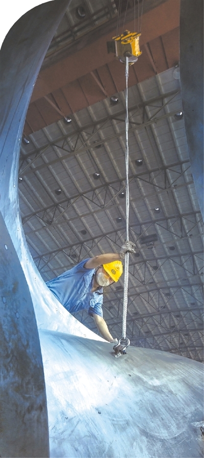 工人正在對白鶴灘水電站百萬千瓦水電機組轉輪葉片進行裝配作業。白鶴灘機組精品標準要求的磁軛中心偏差為0.15毫米,疊裝形成的磁軛中心相對理論中心偏差不超過0.02毫米,遠優于精品標準要求。