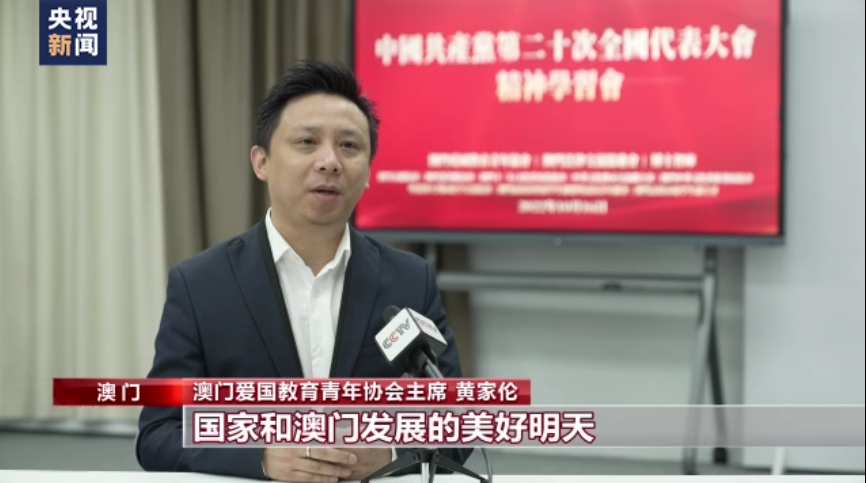 澳門愛國教育青年協會主席 黃家倫:聽了習近平總書記的報告后,大家的心情都特別激動,也非常受鼓舞。報告不僅展示了國家和澳門發展的美好明天,也將為港澳青年施展才華開辟更廣闊的天地。作為澳門青年,我覺得要立志民族復興,一方面要傳承好愛國愛澳的優良傳統,同時也要把個人成長和貢獻國家緊密聯系在一起。