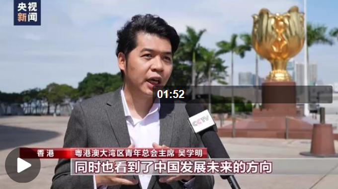 粵港澳大灣區青年總會主席 吳學明:習近平總書記給我們擘畫出青年很美好的一個藍圖,同時也看到了中國發展未來的方向,青年強則國家強,我們應該用我們成功的經歷去感染跟啟迪更多的青年能共同奮斗,團結一致,貢獻香港,貢獻我們的祖國。