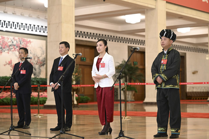 楊彥鋒、宋學文、祁洪芳、李紹杰代表(自左至右)在“黨代表通道”接受采訪。新華社記者 金良快 攝