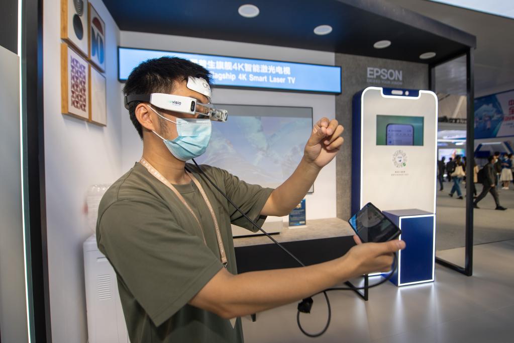 11月10日,觀眾在愛普生公司展臺體驗(yàn)AR感知交互眼鏡系統(tǒng)。新華社記者 江漢 攝