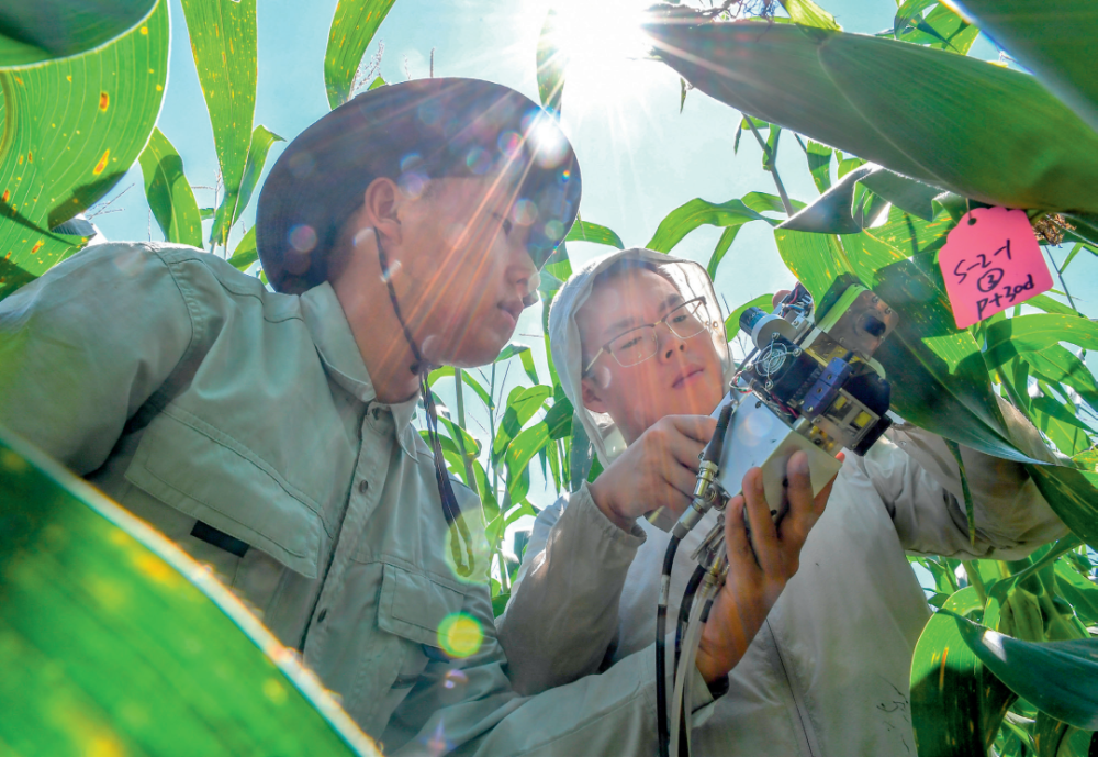在吉林省梨樹縣,中國農業大學在讀博士生沙野(右)和崔帥在試驗田里測量玉米光合作用(2022年8月17日攝)。 張楠攝