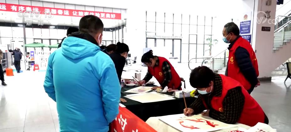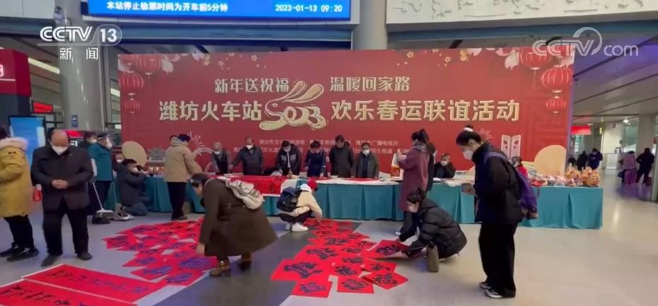在山東濰坊火車站的候車大廳,濰坊風箏、楊家埠木版年畫、高密泥塑等琳瑯滿目,吸引了不少旅客的目光。非遺傳承人和書法家也走進候車大廳,為返鄉的旅客送去真摯的新年祝福。在青州火車站,書法家們還現場揮毫潑墨,一張張包含祝福的“福”字,讓旅客們感受到濃濃的年味。