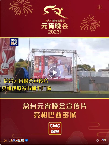 當?shù)貢r間2月4日,中國駐巴西大使館以及伊瓜蘇市政府等機構(gòu)聯(lián)合舉辦“瀑布城喜迎元宵節(jié)”活動。元宵節(jié)期間,伊瓜蘇市城市中心的和平廣場上循環(huán)播放總臺元宵晚會宣傳片和宣傳海報,傳遞中國節(jié)慶文化的獨特魅力。此外,矗立在巴西、阿根廷和巴拉圭三國交界的巴拉那河畔的巨型摩天輪,也于元宵節(jié)當晚點亮“中國紅”,為“瀑布城”再添一絲年味兒。