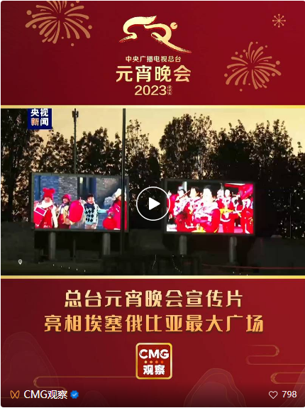 位于埃塞俄比亞首都亞的斯亞貝巴市中心的梅斯克爾廣場的大屏幕也再次亮起中國紅,五塊LED大屏幕循環(huán)播放元宵晚會宣傳片,引發(fā)在場民眾的關(guān)注。