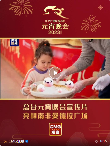 當?shù)貢r間2月3日,總臺元宵晚會宣傳片在南非第一大城市約翰內(nèi)斯堡地標建筑曼德拉廣場精彩亮相,這是總臺元宵晚會相關(guān)內(nèi)容首次在南非公共空間播放。