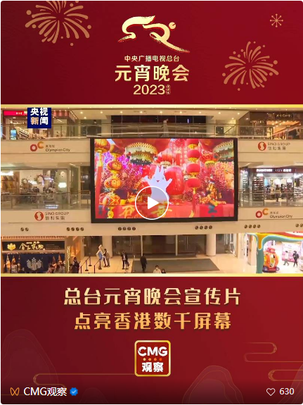 元宵佳節(jié)到來之際,總臺元宵晚會宣傳片已提前點亮香港各地數(shù)千塊大屏幕,實現(xiàn)了香港大屏全覆蓋,為香港的元宵節(jié)添上濃墨重彩的一筆。