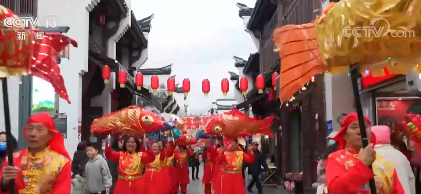 游客 洪燕菲:感覺這里很有韻味,看到張燈結彩的鮮紅的燈籠掛著,還有這邊的青石板路、白墻青瓦以及獨具地方特色的民俗文藝演出,讓我深切體驗到了江南古鎮的新年煙火味兒。