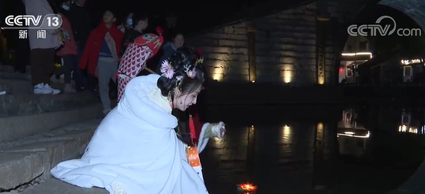 夜幕降臨,身著傳統(tǒng)服飾的人們手提燈籠,行走在青石板街上,將一盞盞承載著心愿的花燈放入河中。在掛滿燈謎牌子的街市,游客和居民參與猜燈謎活動,感受傳統(tǒng)文化與古建筑的魅力。