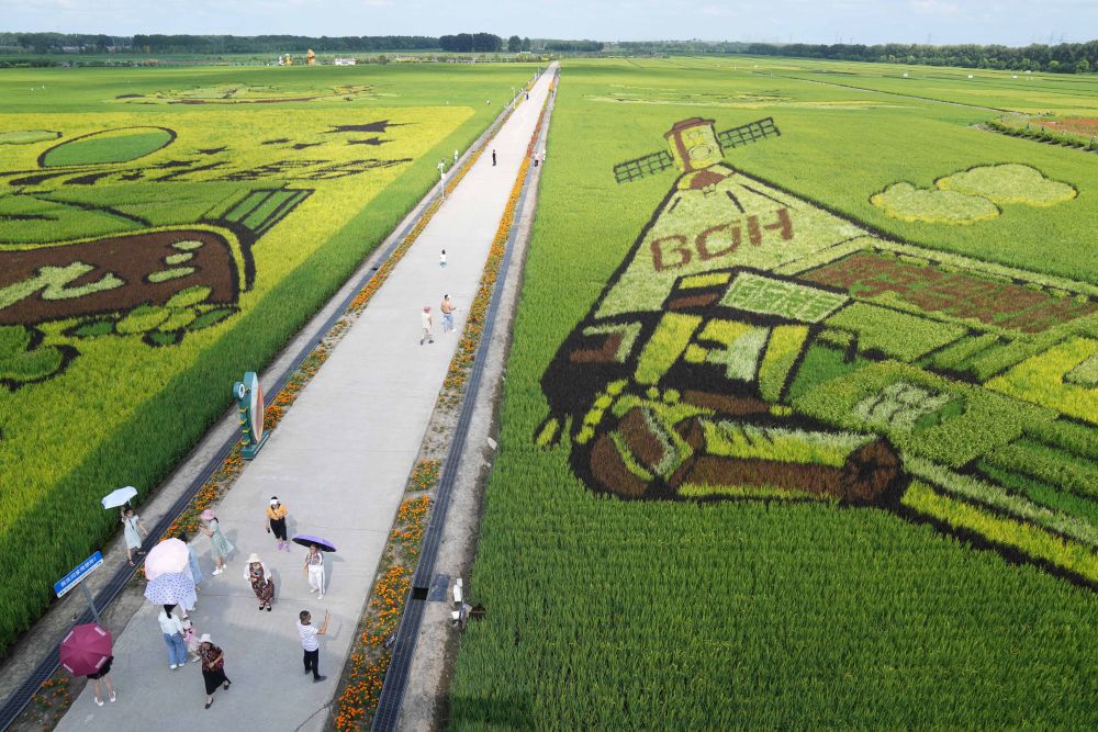 游客在北大荒集團閆家崗農場有限公司農業現代化示范區的稻田里游覽(2023年8月10日攝)。新華社記者 王建威 攝