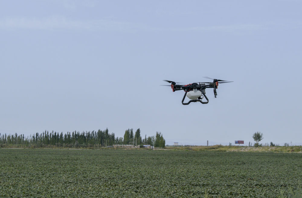 這是2023年9月18日在新疆巴音郭楞蒙古自治州尉犁縣“超級棉田”拍攝的農業無人機。新華社記者 郝建偉 攝