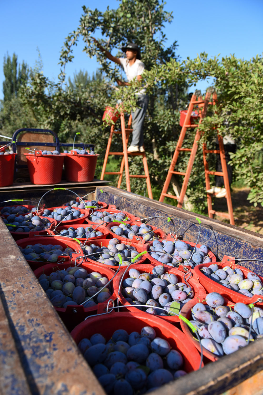 在新疆伽師縣英買里鎮巴格托格拉克村,果農在采摘新梅(2023年8月4日攝)。新華社記者 丁磊 攝