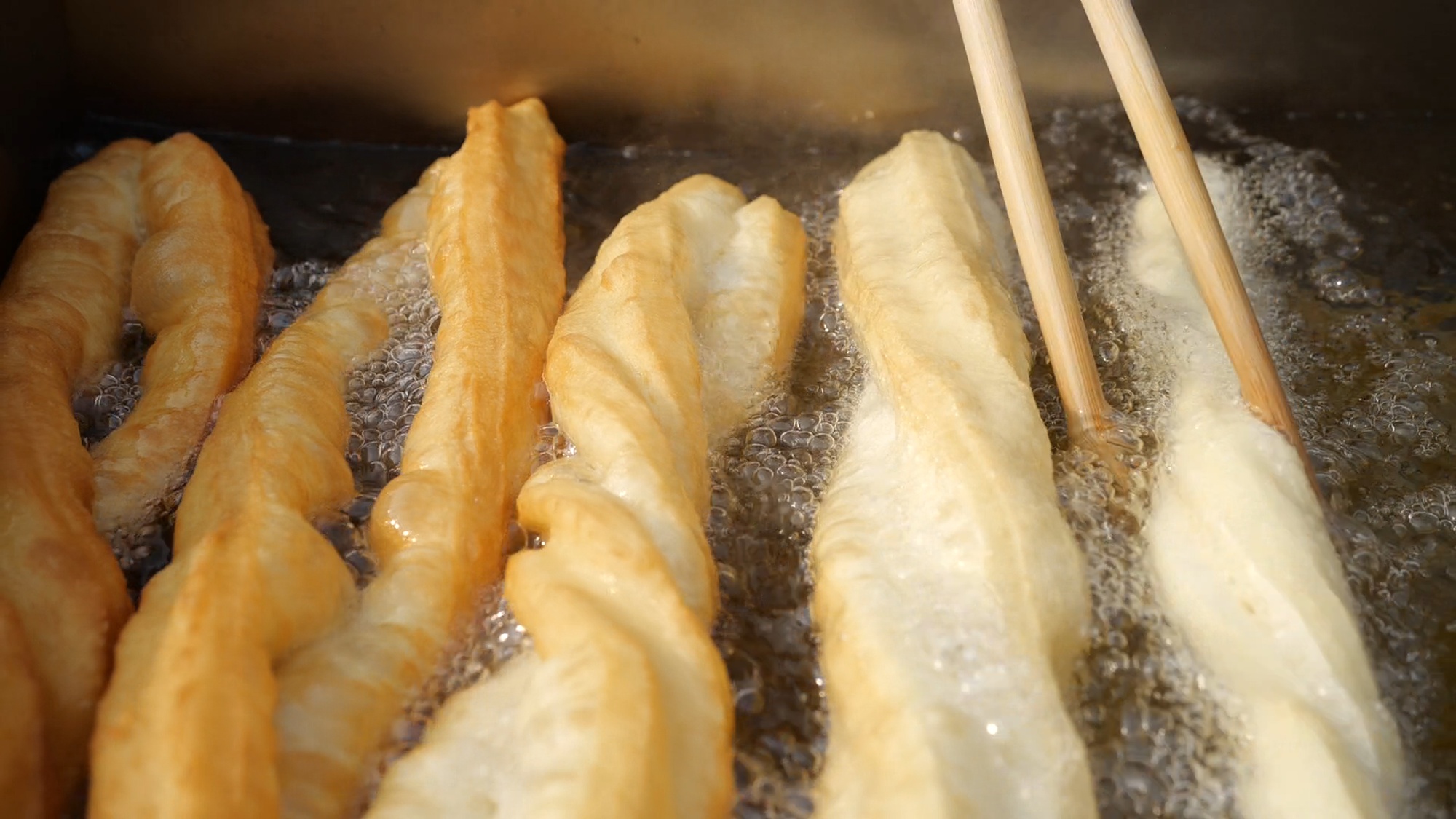 史梅菊賣早餐賣了二三十年,今年她和小叔子江新軍代表江莊村參賽。為防止面團(tuán)粘連,史梅菊用搟面杖在油鍋里沾點(diǎn)油后,再把面團(tuán)搟成長面餅狀。用刀快速切條,兩個面餅條疊在一起,史梅菊再用手摁壓幾下,給油條在鍋里留足發(fā)酵空間,以此保持油條的蓬松感。江新軍負(fù)責(zé)不停地翻轉(zhuǎn)鍋里的油條。