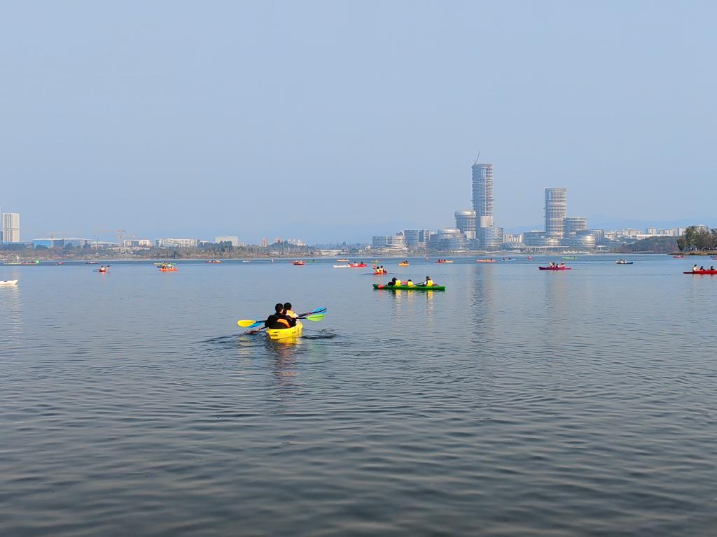 游客在成都興隆湖劃皮劃艇。新華社記者 董小紅 攝