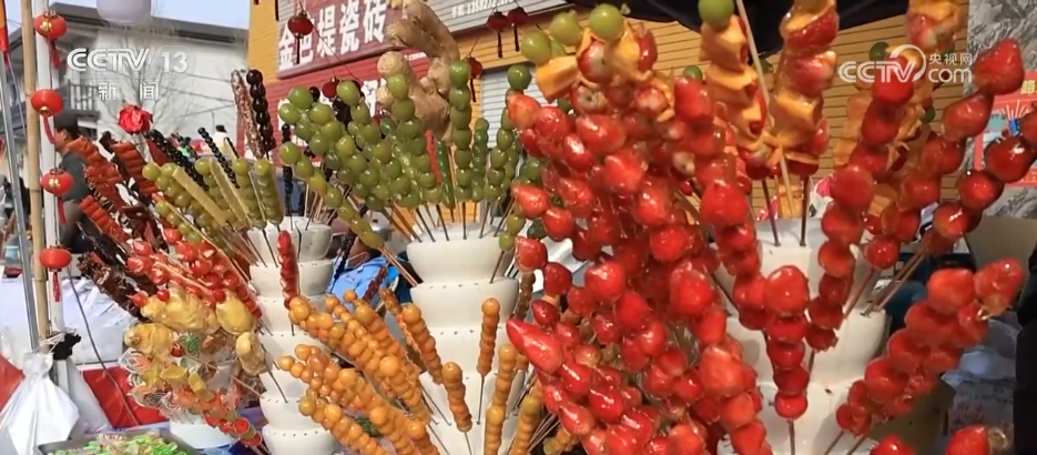 臨近元宵節,在河北滄州任丘市呂公堡鎮的“糖墩廟會”上,摩肩接踵、人頭攢動,攤位一個接一個擠滿整條街。除了傳統的山楂、山藥口味,在這里,西紅柿、葡萄、草莓、柚子,甚至柿子椒、辣條也被裹上了亮晶晶的糖外衣。這些新奇的口味,吸引不少游客買來嘗鮮。