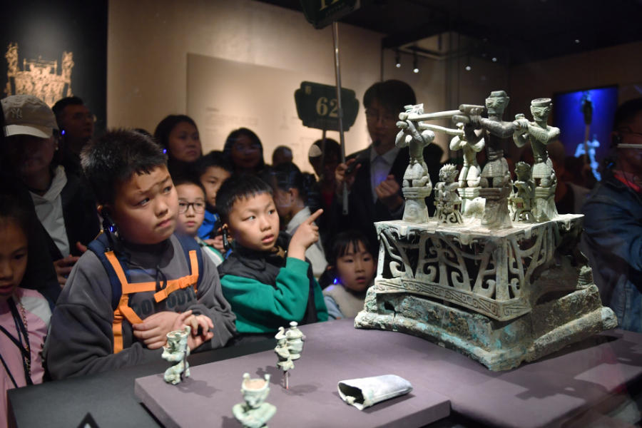 4月3日,小朋友在三星堆博物館觀看展品。新華社記者 盧哲 攝