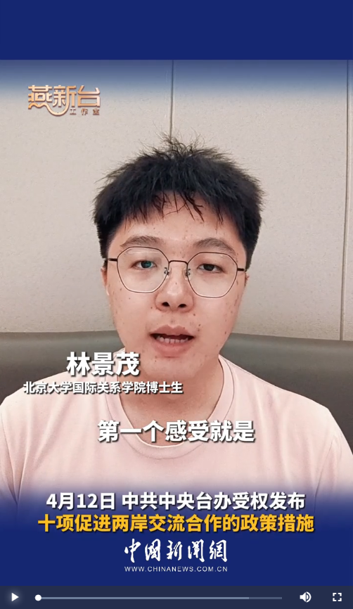 4月12日,中共中央臺辦受權發布十項促進兩岸交流合作政策措施,其中第二條明確,建立國共兩黨青年雙向交流機制化平臺。多位在大陸求學的臺灣學生在接受中新網“燕新臺”工作室專訪時,紛紛表達了對這項交流措施的期待。北京大學國際關系學院博士生林景茂稱,看到這項政策,第一感受就是兩岸青年大交流的時代要回來了。暨南大學新聞專業的林芷瑜表示,兩岸青年交流走向制度化、機制化本就眾望所歸,更是兩岸青年期盼已久的心愿。中山大學博士生吳東憬感慨道,只有親身來大陸實地看一看,才能認清真實的發展面貌,消除刻板印象。上海交通大學媒體與傳播學院碩士生陳姝妃期許,島內青年走訪過后,和身邊親友分享的不只是“我來過大陸”,更能真切感受到“在大陸找到一處值得留下來的地方”。(策劃/采訪:李柏濤 制作:姜雨薇)