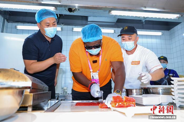 4月13日,尼日利亞籍主播博密(OLUWABUNMI HENRY JIMOH)在海口騎樓老街的椰城喜鹿老爸茶店里,嘗試制作紅米腸粉。中新網記者 駱云飛 攝