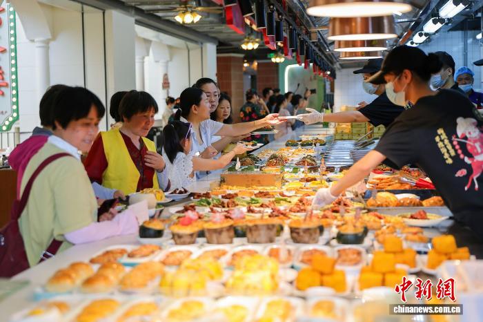 4月13日,海口騎樓老街的椰城喜鹿老爸茶店里,花樣繁多的老爸茶小吃吸引顧客選購。中新網記者 駱云飛 攝