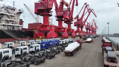 在江蘇連云港港贛榆港區(qū)散貨碼頭,一輛輛國(guó)產(chǎn)車(chē)輛和各類工程機(jī)械設(shè)備正有序裝船,整裝待發(fā)。今年以來(lái),港區(qū)銷往南亞、中亞、波斯灣、西非等地區(qū)的出口訂單穩(wěn)步增長(zhǎng),國(guó)產(chǎn)客車(chē)、礦卡、自卸車(chē)、挖掘機(jī)、裝載機(jī)等工程機(jī)械成為出口主力。