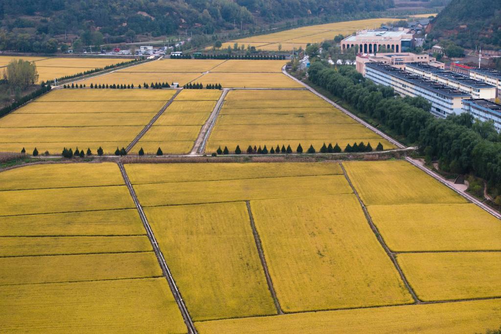 這是2025年10月16日拍攝的南泥灣稻田景色(無人機照片)。新華社記者 邵瑞 攝