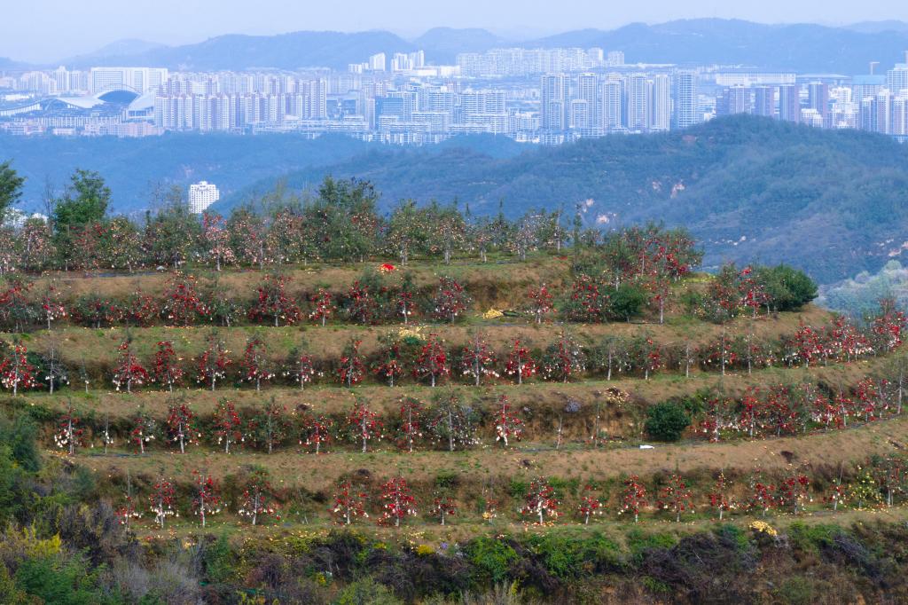 這是延安市寶塔區橋溝街道煙洞溝村蘋果園景色(2025年10月17日攝,無人機照片)。新華社記者 邵瑞 攝