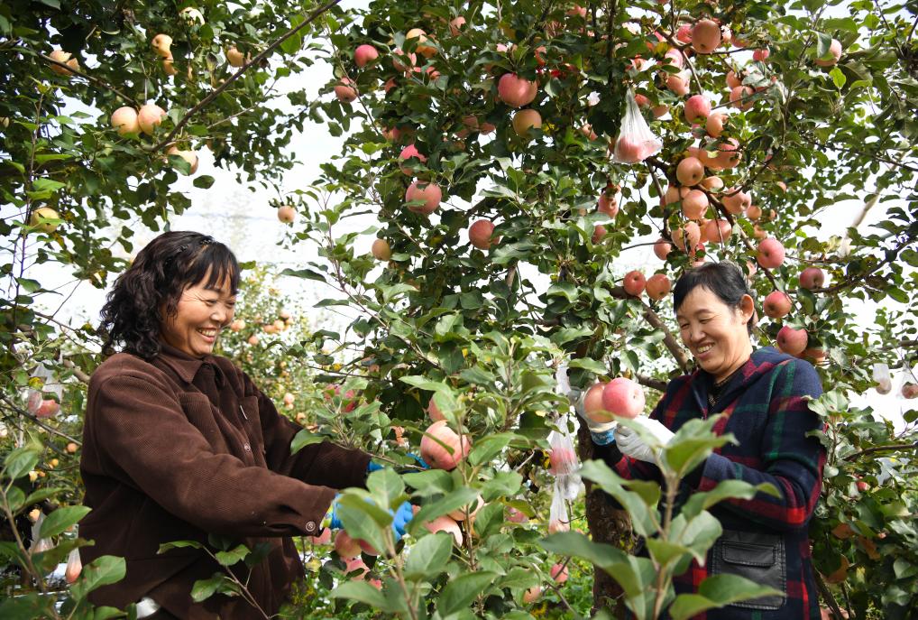 2025年10月17日,果農在延安市寶塔區橋溝街道煙洞溝村采收蘋果。新華社記者 張博文 攝