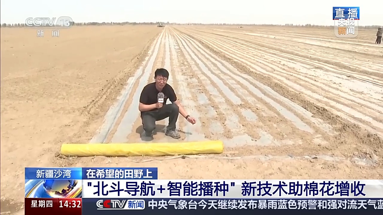 高鵬飛:您瞧,我身后這臺(tái)棉花播種機(jī),正不緊不慢地往前開(kāi)。從空中看下去,播完種的土地就像鋪上了一條條透明的絲帶,筆直筆直的。怎么能做到這么整齊劃一?全靠有北斗導(dǎo)航的無(wú)人駕駛設(shè)備。這種設(shè)備精度很高,每公里誤差不超過(guò)2厘米。為什么要這么精準(zhǔn)?因?yàn)楹竺娴闹懈⒋蛩庍@些田間管理,也都靠帶著北斗導(dǎo)航的設(shè)備來(lái)干。這樣從播種到管理,環(huán)環(huán)相扣,無(wú)縫銜接。像這種復(fù)合式精量化播種機(jī),后面還掛著好幾個(gè)裝置,它一過(guò),鋪設(shè)滴灌帶、地膜、打孔、下種、覆土一氣呵成。一臺(tái)機(jī)器一天能干120多畝,效率那是翻著跟頭往上漲。
