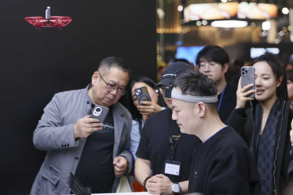 3月12日,在上海新國(guó)際博覽中心追覓科技展位腦機(jī)接口展臺(tái),工作人員演示通過(guò)腦電波操作無(wú)人機(jī)。新華社記者王翔 攝