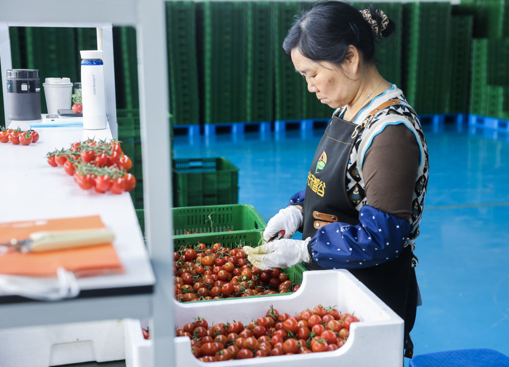 4月15日,村民在位于浙江省海寧市黃灣鎮(zhèn)的浙江光禾智谷生態(tài)農(nóng)業(yè)有限公司車間內(nèi)分揀、打包剛采摘下來(lái)的番茄。近年來(lái),海寧市積極推進(jìn)鄉(xiāng)村片區(qū)組團(tuán)發(fā)展,助力鄉(xiāng)村振興。新華社記者徐昱 攝