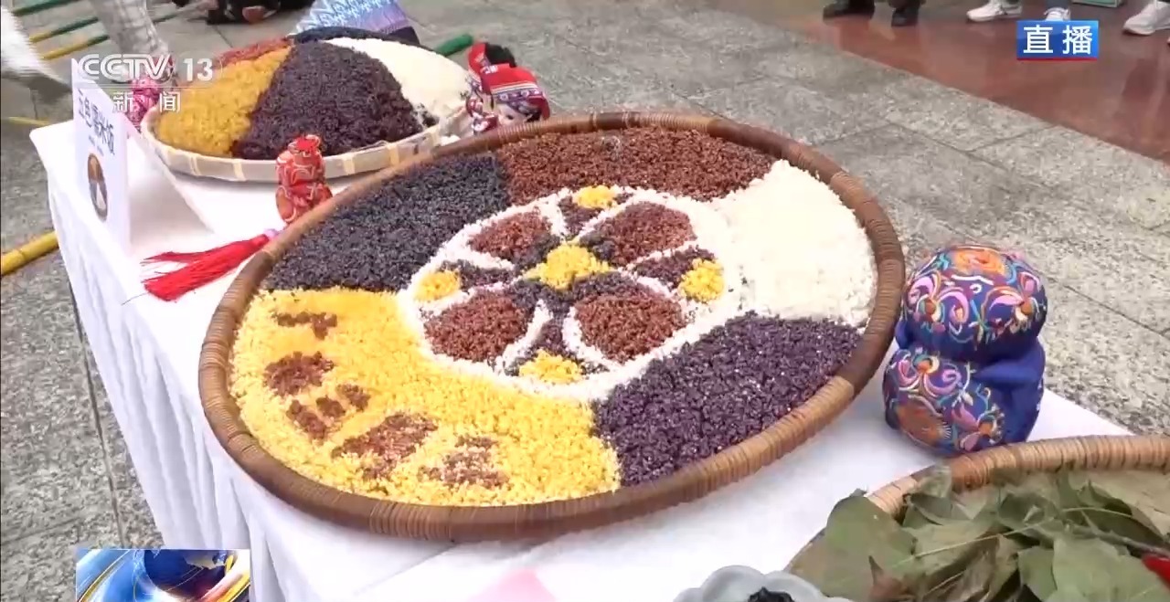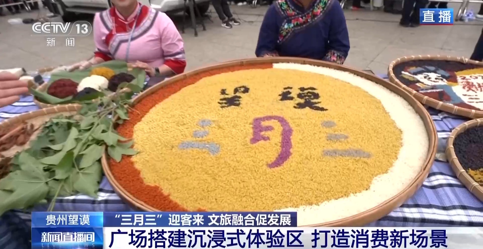 除了巡游展演外,這次望謨“三月三”活動中,在廣場搭建了互動體驗區,打造消費新場景,游客們可以分批進入現場體驗。這里展示的就是望謨紫茶的炒制以及沖泡技藝;蠟染制作體驗區,從織布到畫蠟再到浸染,全流程展現指尖上的藍白美學。在望謨,布依族“無糯不成席”。簸箕里“望謨三月三”歡迎您的字樣就是用五顏六色的糯米飯拼成的。用春天鮮嫩的楓香葉、綻放的密蒙花等植物染出艷麗的色彩,每一口都帶著春天的味道。