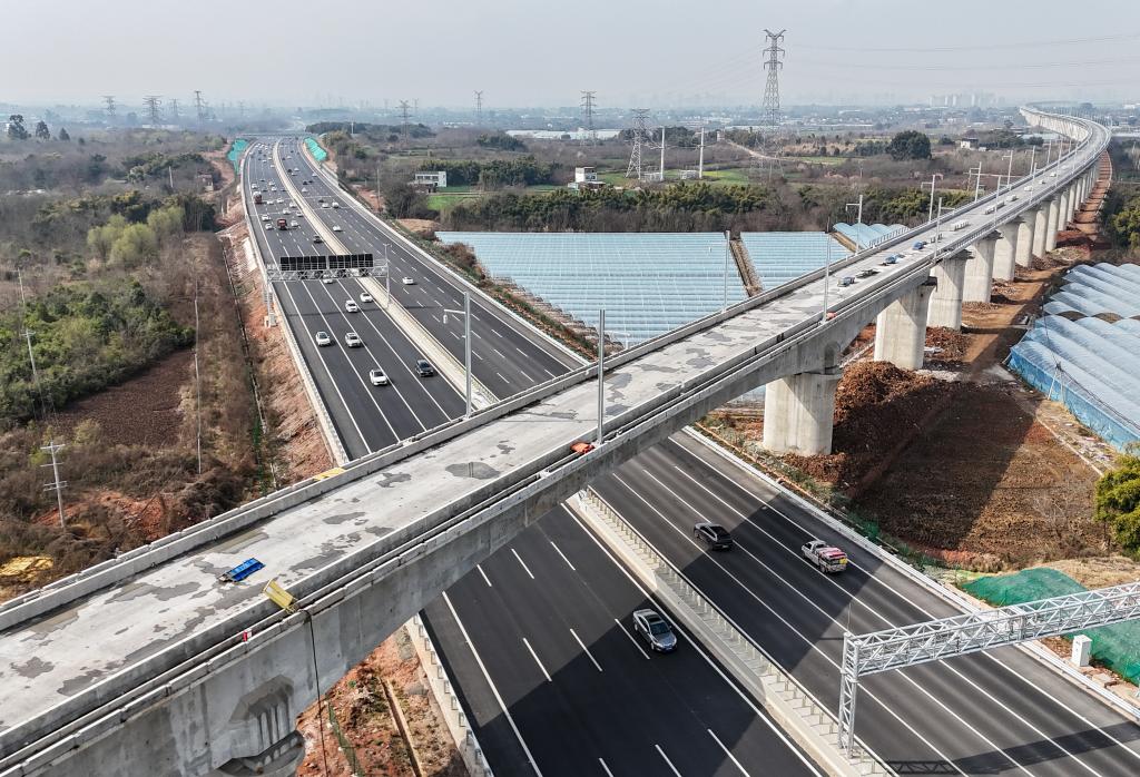 2月10日,成渝中線高鐵四川段橋梁建設全部完成。這是當日在成都市拍攝的成渝中線高鐵最長橋梁龍泉特大橋跨滬蓉高速公路(無人機照片)。新華社記者王曦 攝